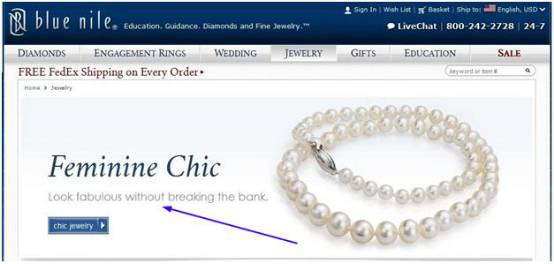 在当今的后决策销售时代,强调好处而非功能的着陆页文案风格显得更加重要。如下图所示,珠宝销售品牌Blue Nile便在其主页应用了以用户利益为中心的文案: