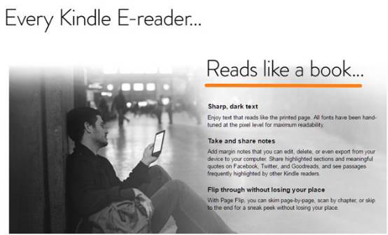 专注于benefits的文案风格适用于大多数种类的产品。例如亚马逊的Kindle Voyage页面便强调了Kindle“如同阅读真书”。在这之后,页面剩余部分的文案才进一步介绍产品相关功能,以实现这一好处。
