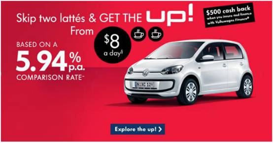 下方的这则广告便是将金额转化成人们每天消费的咖啡。年利率5.94%是大多数顾客较难理解的数字,而转化为8块钱/天显得更为通俗易懂,而进一步转化为省下的8块钱 =“两杯拿铁”则更为直观,顾客一下子就能懂。